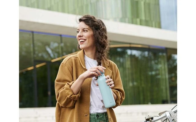 La cubierta exterior de la botella se mantiene siempre seca y fresca, independientemente de la temperatura interior. Un consejo práctico: enjuague la botella con agua caliente o helada antes de usarla, esto prolonga el tiempo que su bebida se mantiene a la temperatura deseada. Para garantizar la mejor experiencia de consumo durante el mayor tiempo posible, recomendamos limpiar la botella termo de color a mano. La tapa y sus piezas de plástico también pueden limpiarse en el lavavajillas.