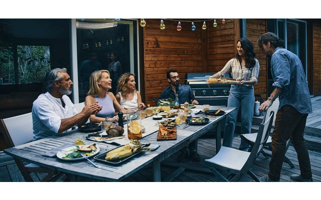 Con sus 4 quemadores patentados Blue Flame Power fabricados en acero inoxidable, la 4 Series Premium 37384 garantiza un calor uniforme y potente con un número significativamente menor de llamaradas para una experiencia de barbacoa satisfactoria. Además, la barbacoa, con su elegante carro de acero gris, será el centro de todas las miradas en su jardín.