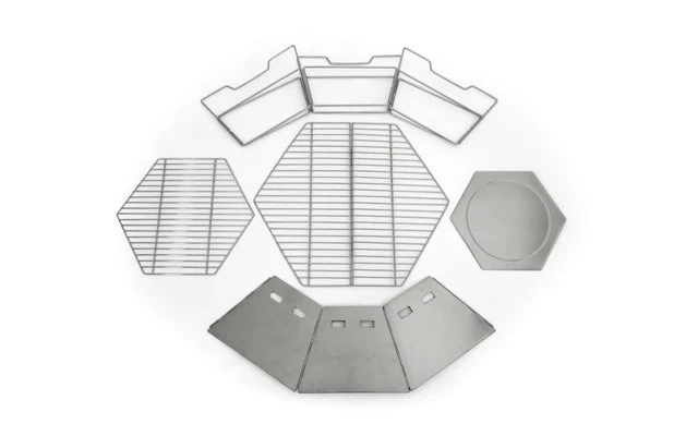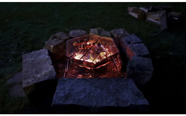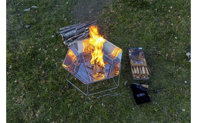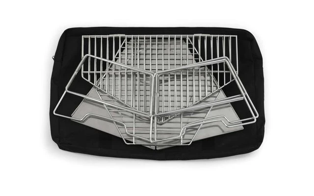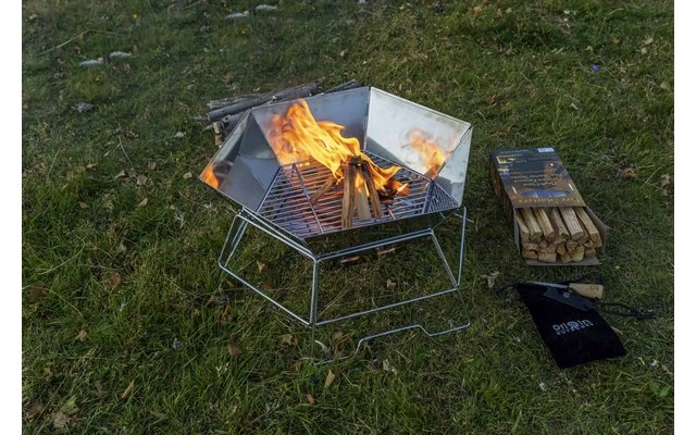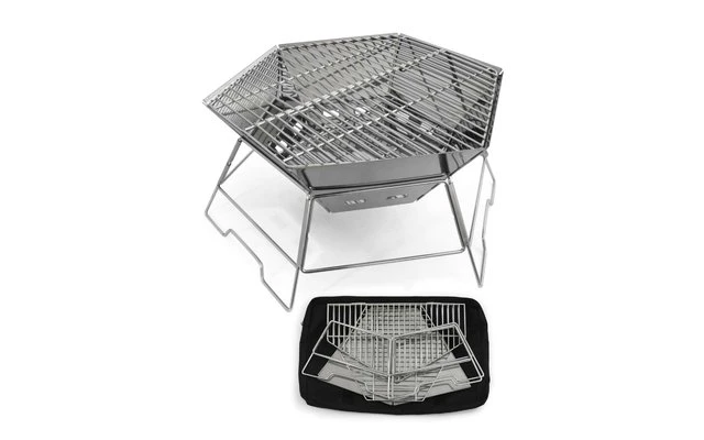 Debido a su diseño, también puede utilizarse como recipiente para el fuego. Además, la parrilla cuenta con una placa base insertable, una rejilla para el carbón y una gran rejilla plegable en el centro