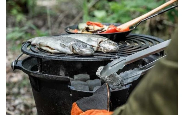 Dado que la barbacoa siempre está caliente, el efecto antiadherente natural de la parrilla de hierro fundido es una ventaja decisiva. Con el carbón y las briquetas para barbacoa, su parrilla se calienta rápidamente y durante mucho tiempo. Puede combinar la parrilla de fuego con una olla de fuego (Dutch Oven) para que el excelente almacenamiento de calor haga que se cocine con especial ahorro de energía.