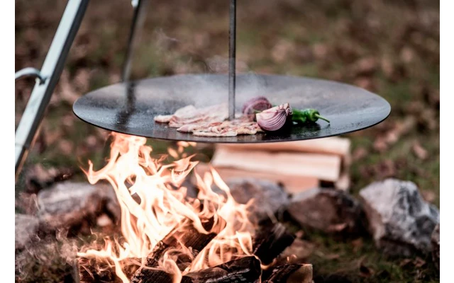 Al igual que cuando se cocina con la parrilla y los cuencos de fuego Petromax, se crean diferentes zonas de cocción que permiten asar filetes en el centro y cocinar suavemente las verduras o mantener la comida caliente en el borde. Con un diámetro de 56 cm, puedes ofrecerte a ti y a tu tropa de forajidos una gran selección de platos diferentes al aire libre.