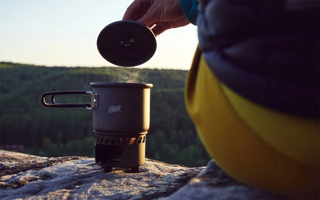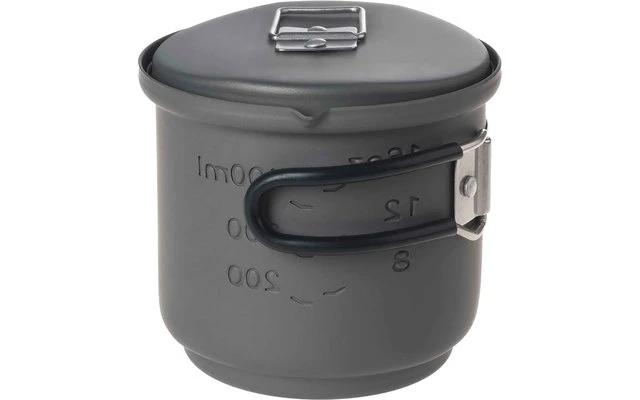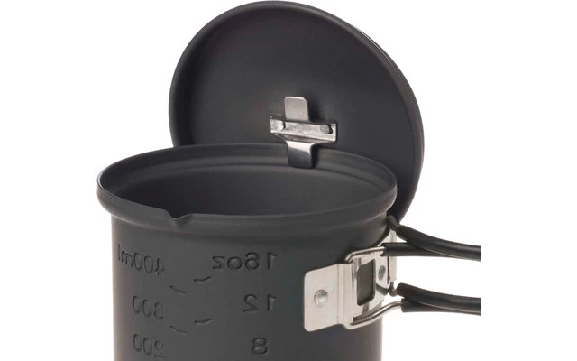 Cuando el tamaño del paquete importa, este juego de cocina compacto y apilable es la opción ideal. La olla, fabricada en aluminio de alta calidad, tiene una capacidad aproximada de 585 ml y está equipada con un indicador de volumen en Oz y litros. El soporte de aluminio extremadamente ligero puede transportarse en la olla para ahorrar espacio. Especialmente prácticos: la suspensión de la tapa y las asas plegables de acero inoxidable que ahorran espacio. Se suministra en una práctica bolsa de malla y se dispara con pastillas de combustible seco Esbit de 14 g.