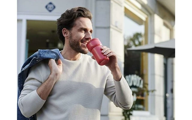 Y de paso, también salvas el medio ambiente, porque ahorras hasta 260 vasos desechables al año con la taza de viaje reutilizable Gracias a su tamaño compacto, la taza de viaje cabe en casi cualquier bolsa. Y no te preocupes: ¡la taza es 100% a prueba de fugas! La taza de viaje de doble pared con una capacidad de 275 ml mantiene tus bebidas calientes hasta 30 minutos y puede limpiarse completamente en el lavavajillas después de su uso.