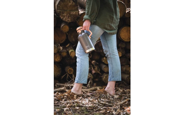 Termo de acero inoxidable de doble pared con gran abertura de llenado y robusta asa de plástico.
