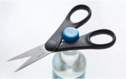 Tijeras resistentes con hoja inferior dentada para facilitar el corte.