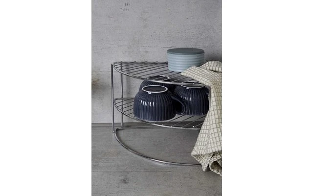 La exclusiva estantería de esquina para vajilla se adapta a cualquier rincón de la cocina ahorrando espacio. Con sus dos estantes y un nivel adicional, la estantería cromada ofrece mucho espacio de almacenamiento para la vajilla y los utensilios de cocina o los aparatos de cocina más pequeños. Los alimentos también se pueden guardar al alcance de la mano en la práctica estantería. Esto hace que el escurreplatos sea un útil ayudante en todos los hogares.